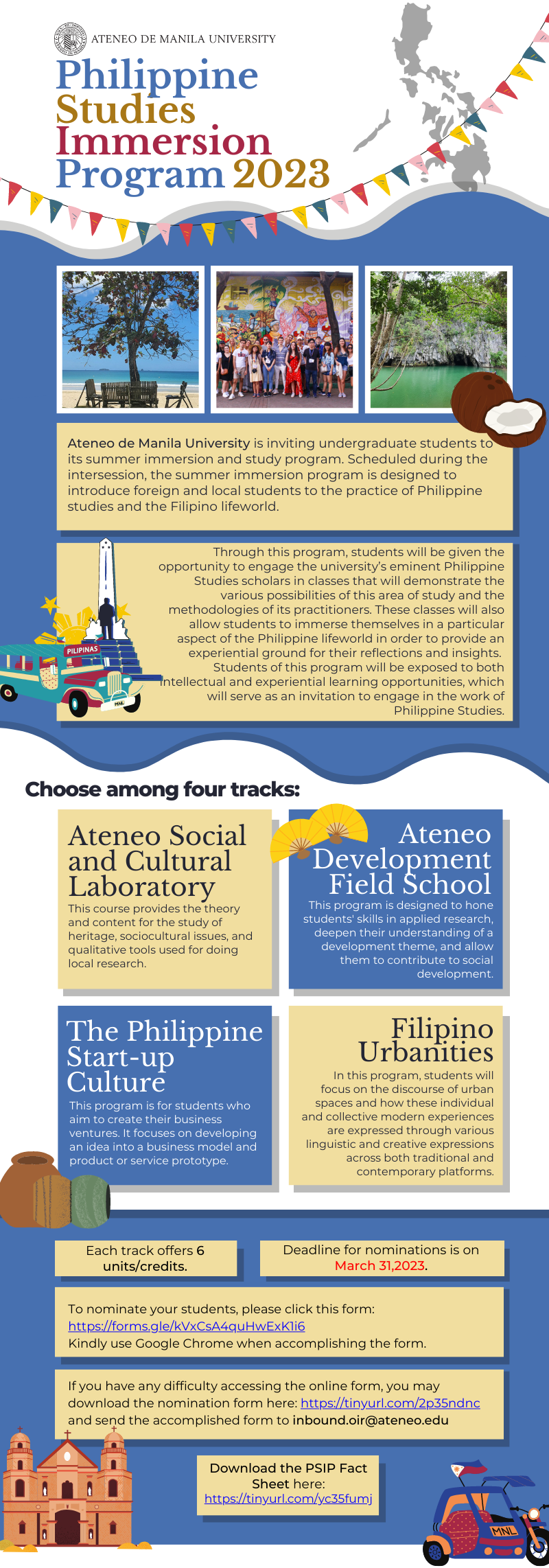 The Ateneo de Manila University is inviting undergraduate students to its 2023 Summer program: Philippine Studies Immersion Program (PSIP). PSIP is designed to introduce international and local students to the practice of Philippine studies and the Filipino lifeworld through each of the tracks to be taught during the summer months of June and July.