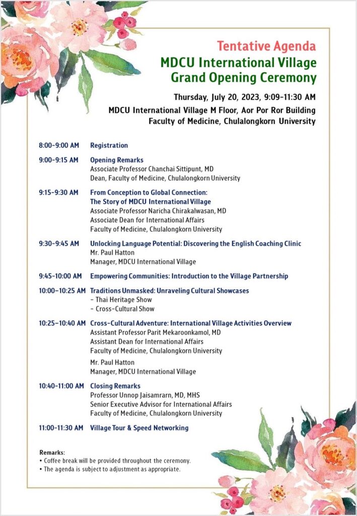 The Faculty of Medicine, Chulalongkorn University, is delighted to extend a formal invitation to you to attend the Grand Opening Ceremony of the MDCU International Village.