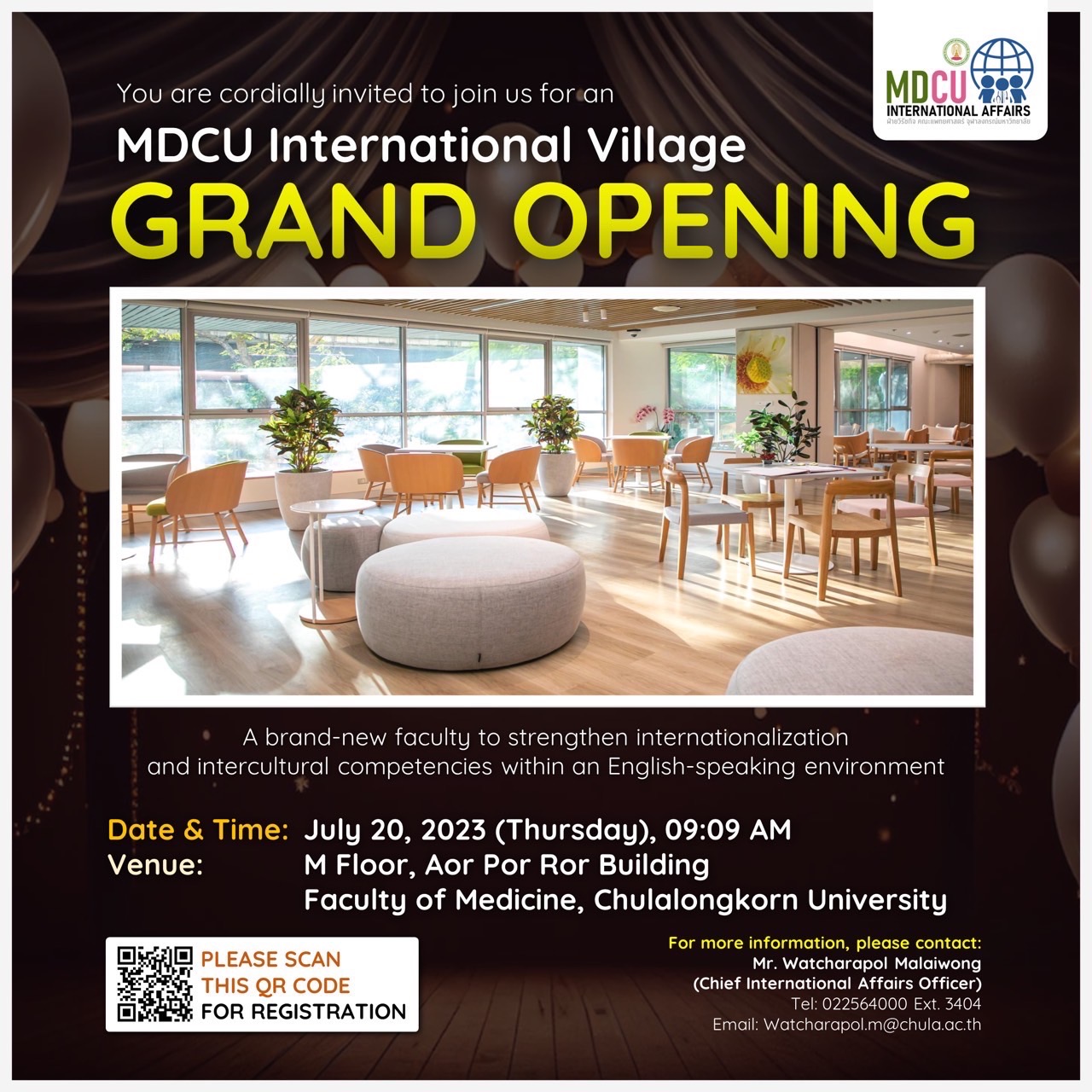 The Faculty of Medicine, Chulalongkorn University, is delighted to extend a formal invitation to you to attend the Grand Opening Ceremony of the MDCU International Village.