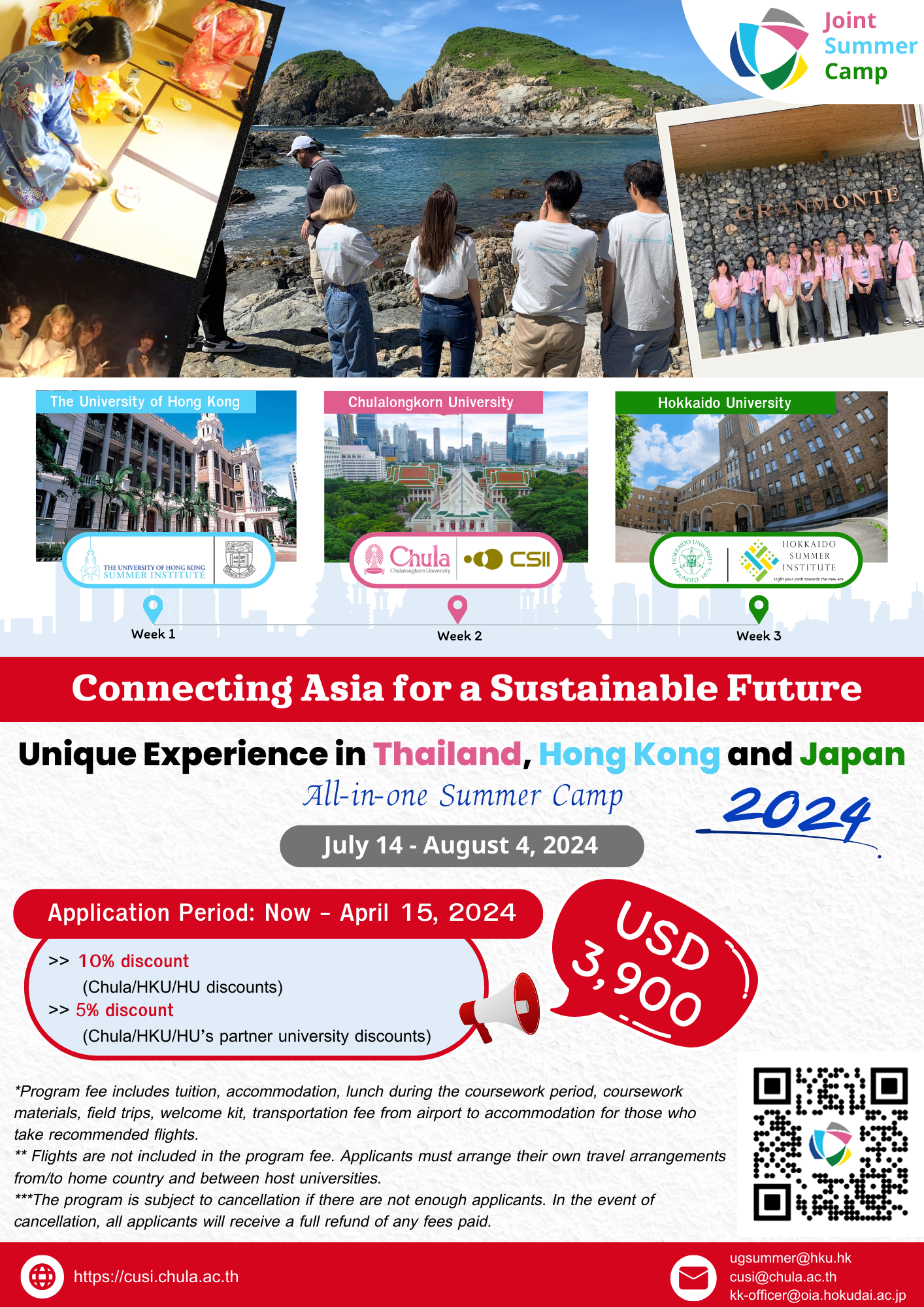 Chulalongkorn University is delighted to invite students to 2024 Chula Joint Summer Camp – Connecting Asia for a Sustainable Future, the All-in-One Summer Camp in Thailand, Hong Kong, and Japan on July 14 – August 4, 2024 (three weeks).