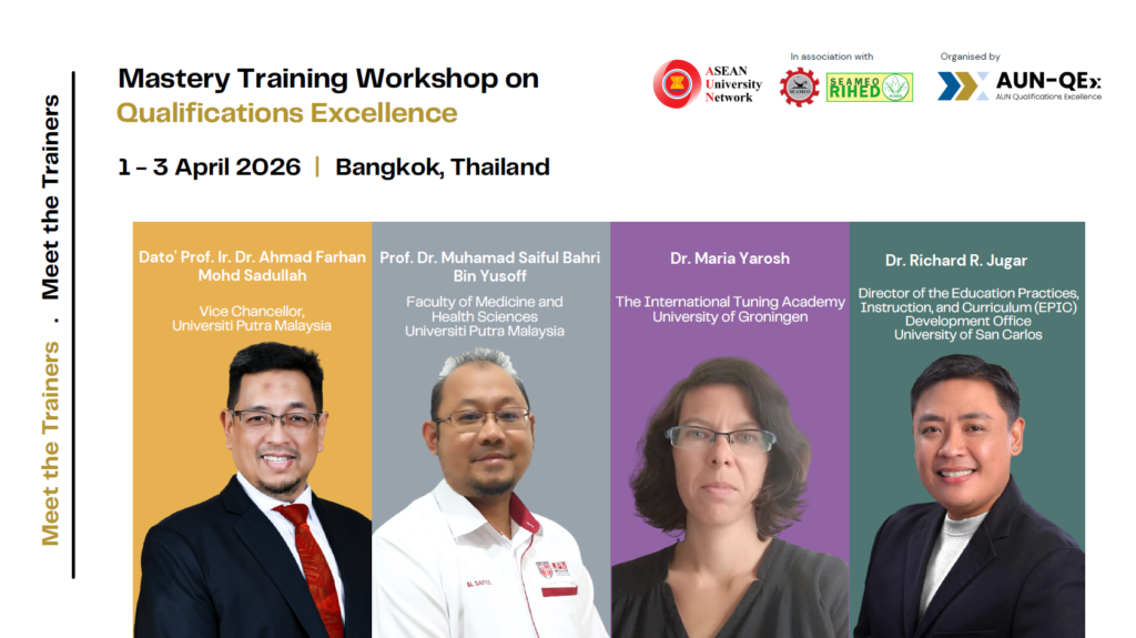 Organised by the ASEAN University Network (AUN) through its AUN Qualifications Excellence (AUN-QEx) initiative, in collaboration with SEAMEO RIHED, this three-day intensive workshop is designed for academic staff, programme directors, heads of department, quality assurance officers, and teaching and learning support teams committed to curriculum development and academic quality.