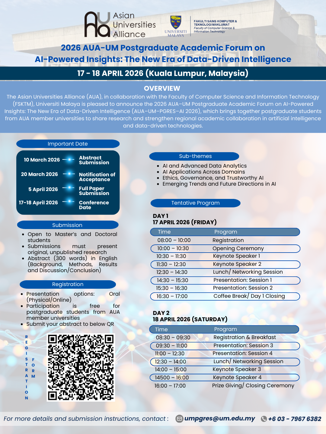 The AUA Secretariat is pleased to announce that the “2026 AUA-UM Postgraduate Academic Forum on AI-Powered Insights: The New Era of Data-Driven Intelligence” is now calling for abstracts. The program was approved at the AUA Board Meeting 2025 and will be held on 17 – 18 April 2026 at Universiti Malaya.
