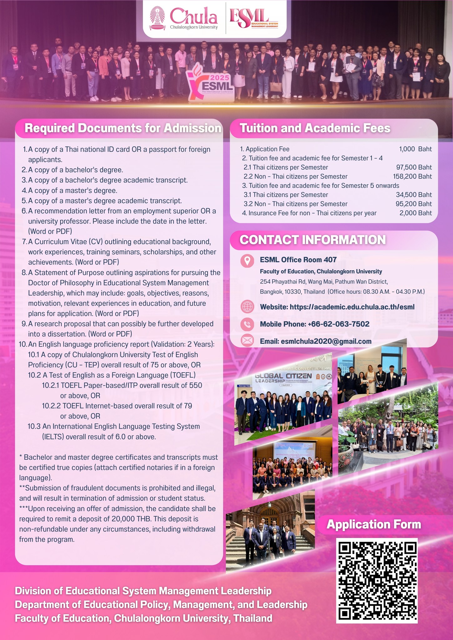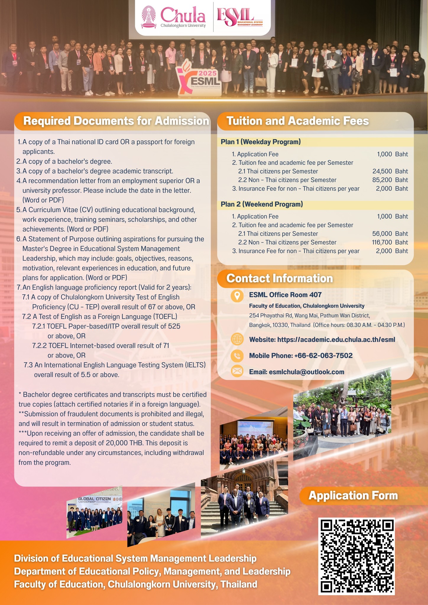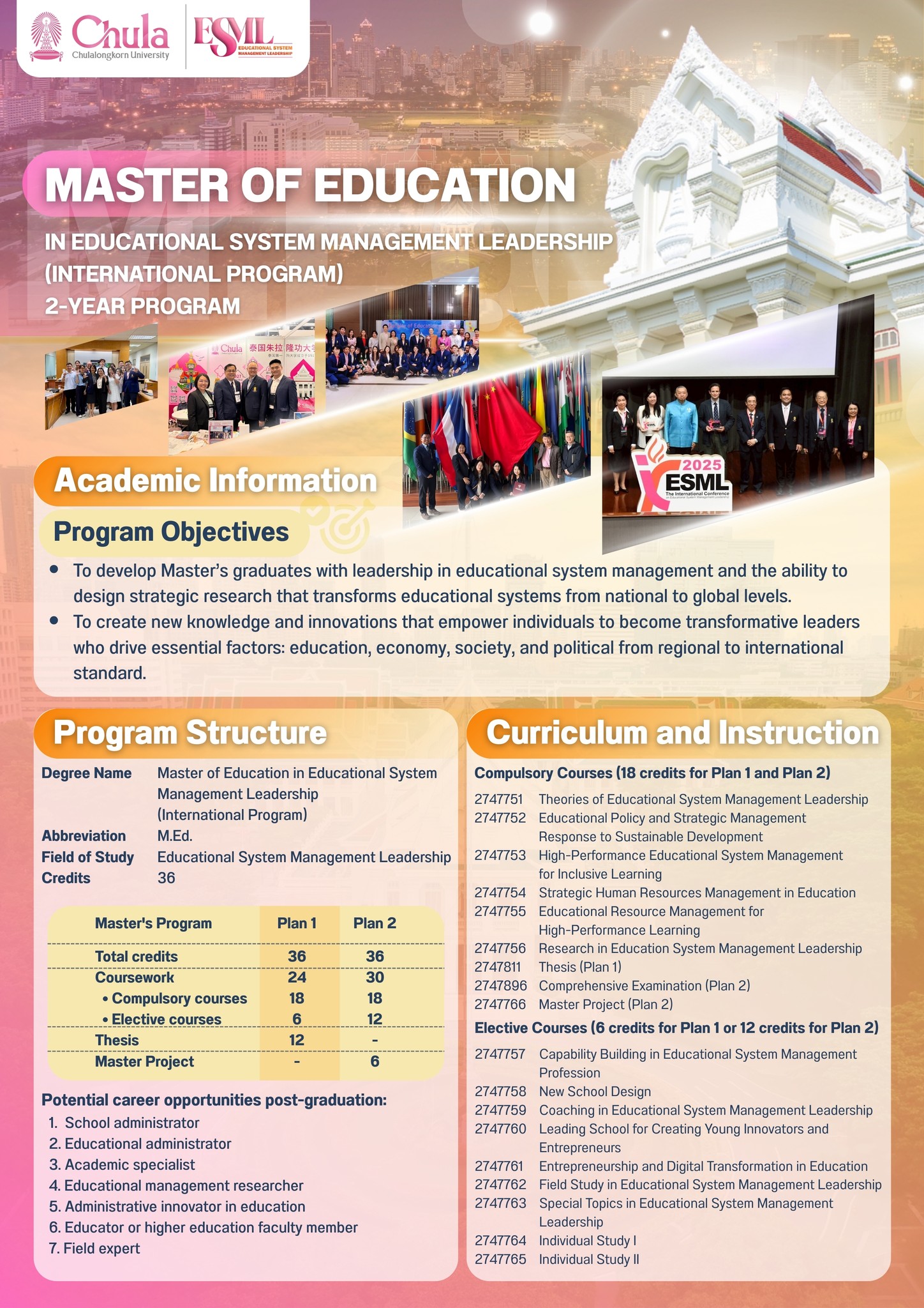 Division of Educational System Management Leadership (International Program), Faculty of Education, Chulalongkorn University, Thailand, is now calling for applications for the Academic Year 2026. (The semester begins in August 2026) Programs Offered