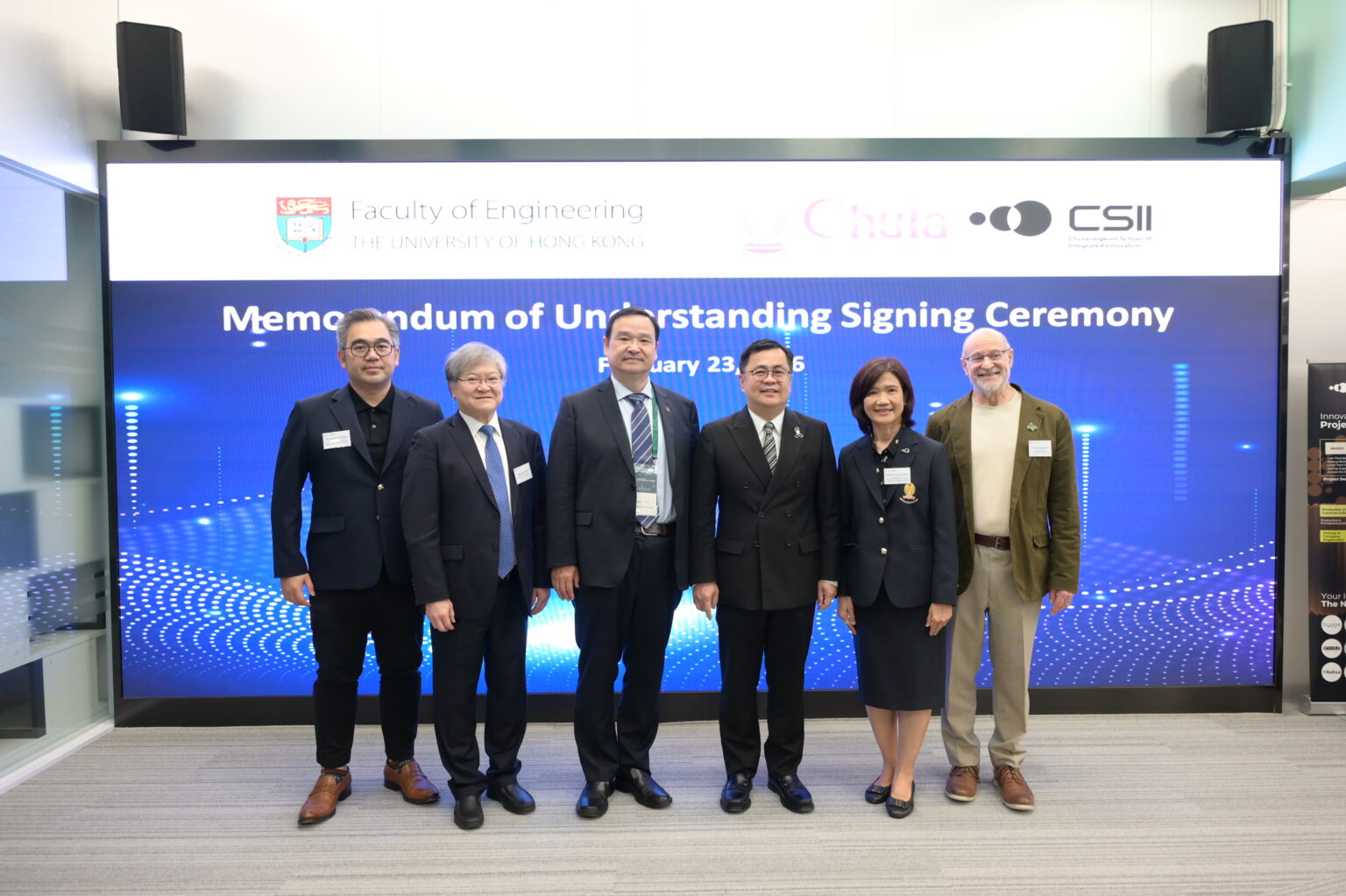 The agreement was signed by Professor David Srolovitz, Dean of Engineering, the HKU, and Professor Suchada Sukrong, Executive Director of the Chulalongkorn School of Integrated Innovation. The signing was witnessed by Professor Yin Xiaobo, Vice-President and Pro-Vice-Chancellor (Global), the HKU, and Dr. Ronnakorn Vaiyavuth, Deputy Executive Director for Innovation and Commercialization, Chulalongkorn School of Integrated Innovation.