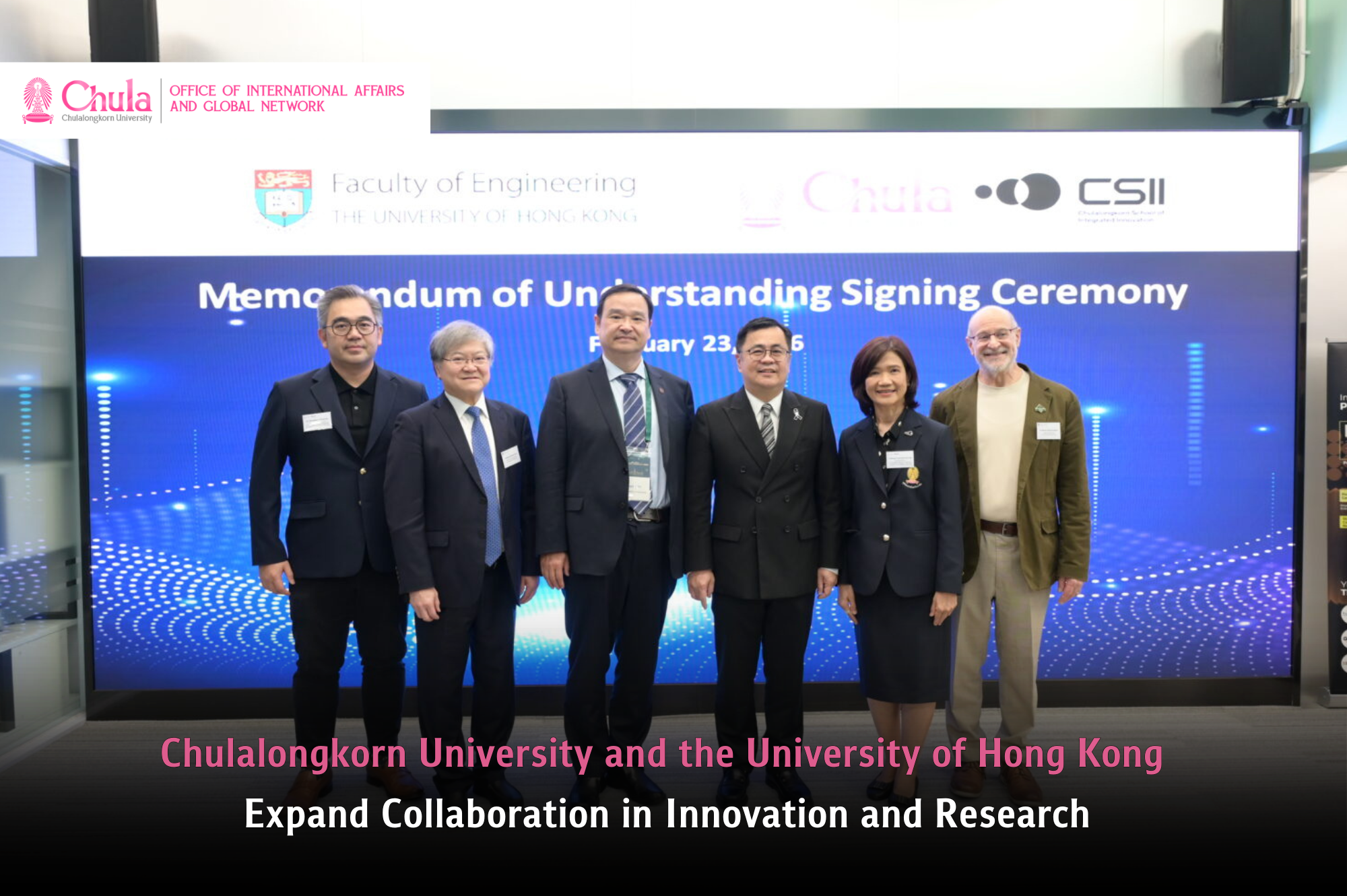 On February 23, 2026, the Chulalongkorn University executive team, led by Professor Dr. Parichart Sthapitanonda, Vice President for Academic Affairs, attended the agreement signing ceremony between the Institute of Thai Studies, Chulalongkorn University, and the Centre of Buddhist Studies, the University of Hong Kong.