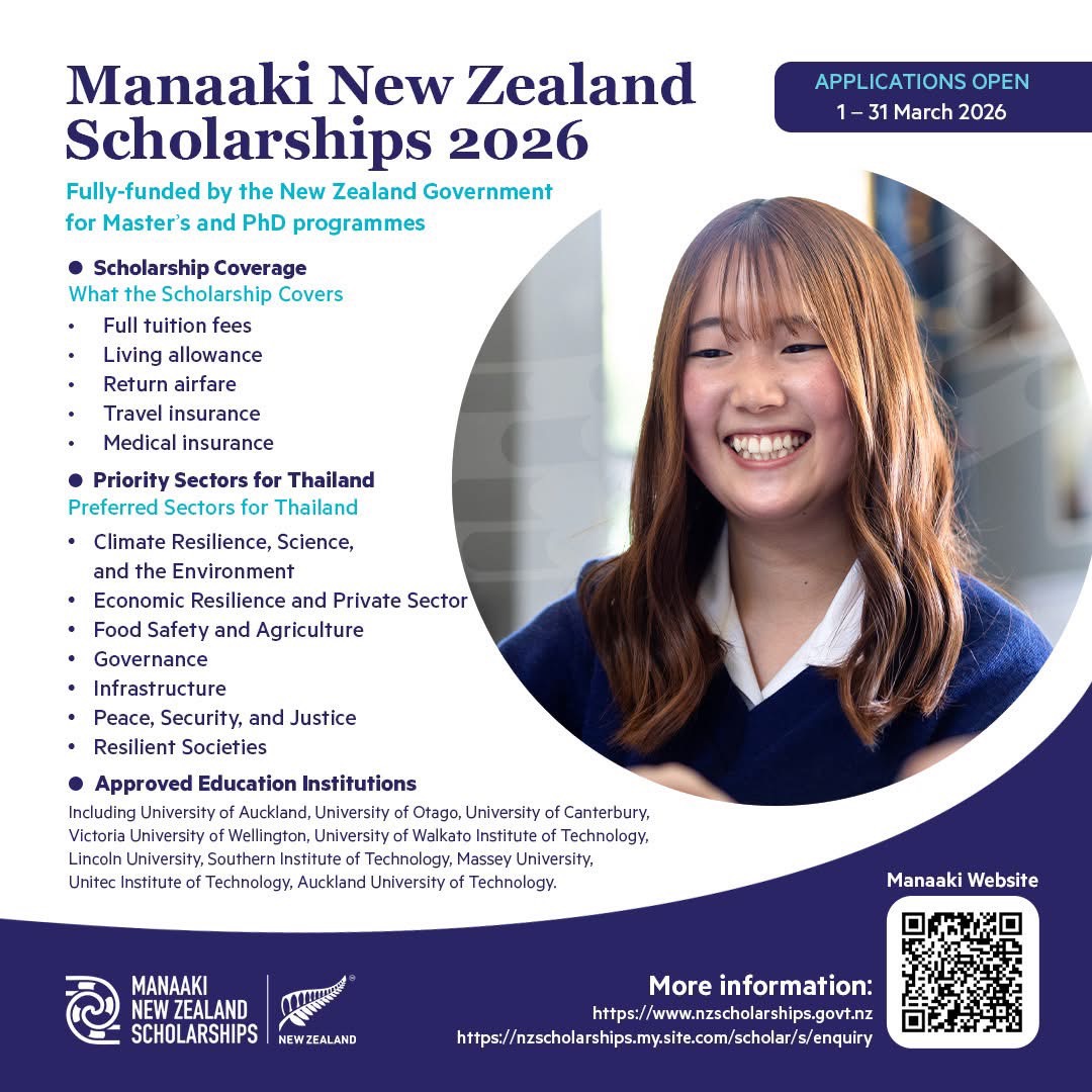 The New Zealand Government offers Manaaki New Zealand Scholarships (Fully Funded Scholarships) to Thai candidates to undertake full-time postgraduate studies in New Zealand in 2027.