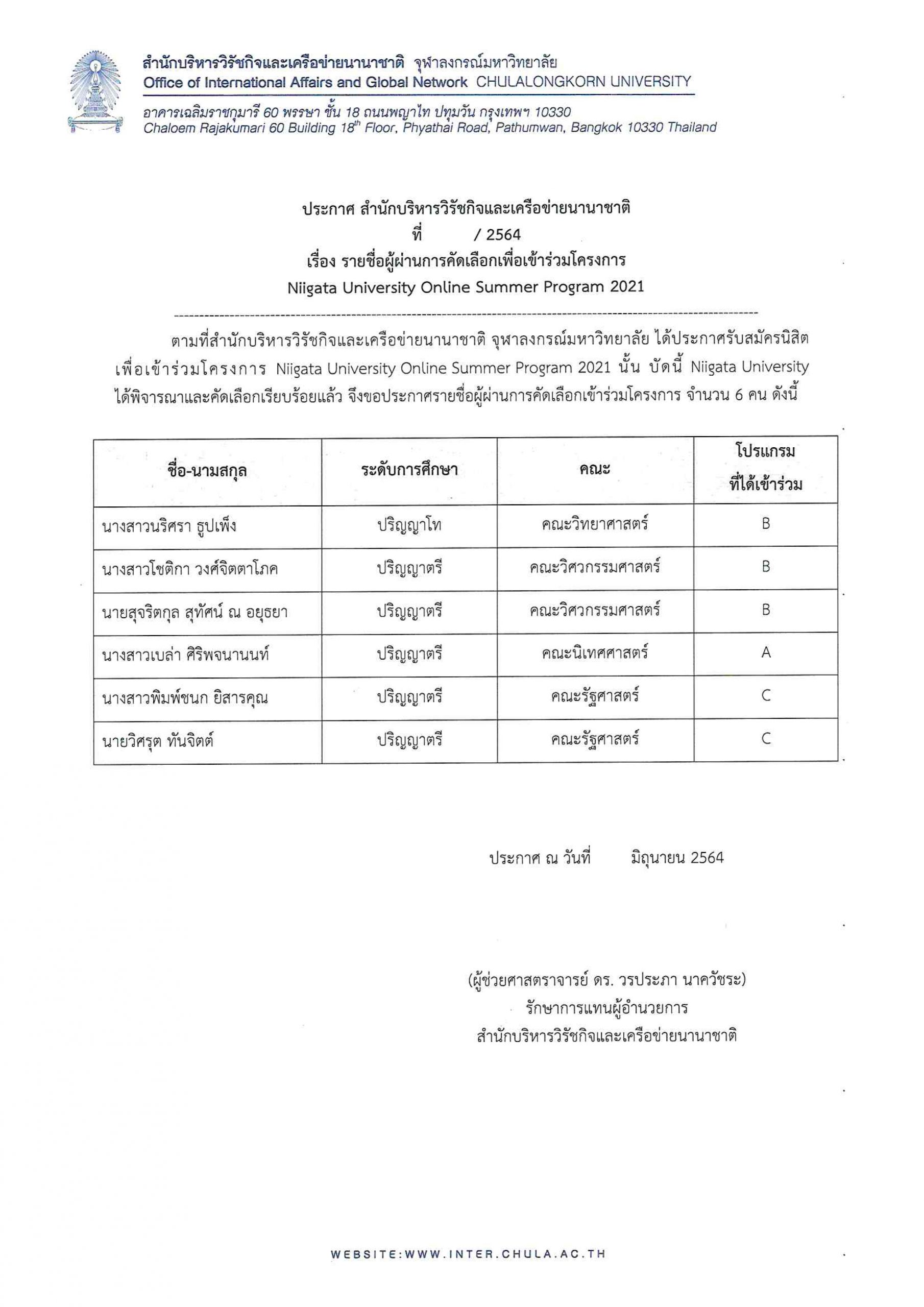 List of the students who are selected to take part in the Niigata University Summer Program 2021 24 June 2021 Recent news Niigata University will contact students directly for the details of the program.