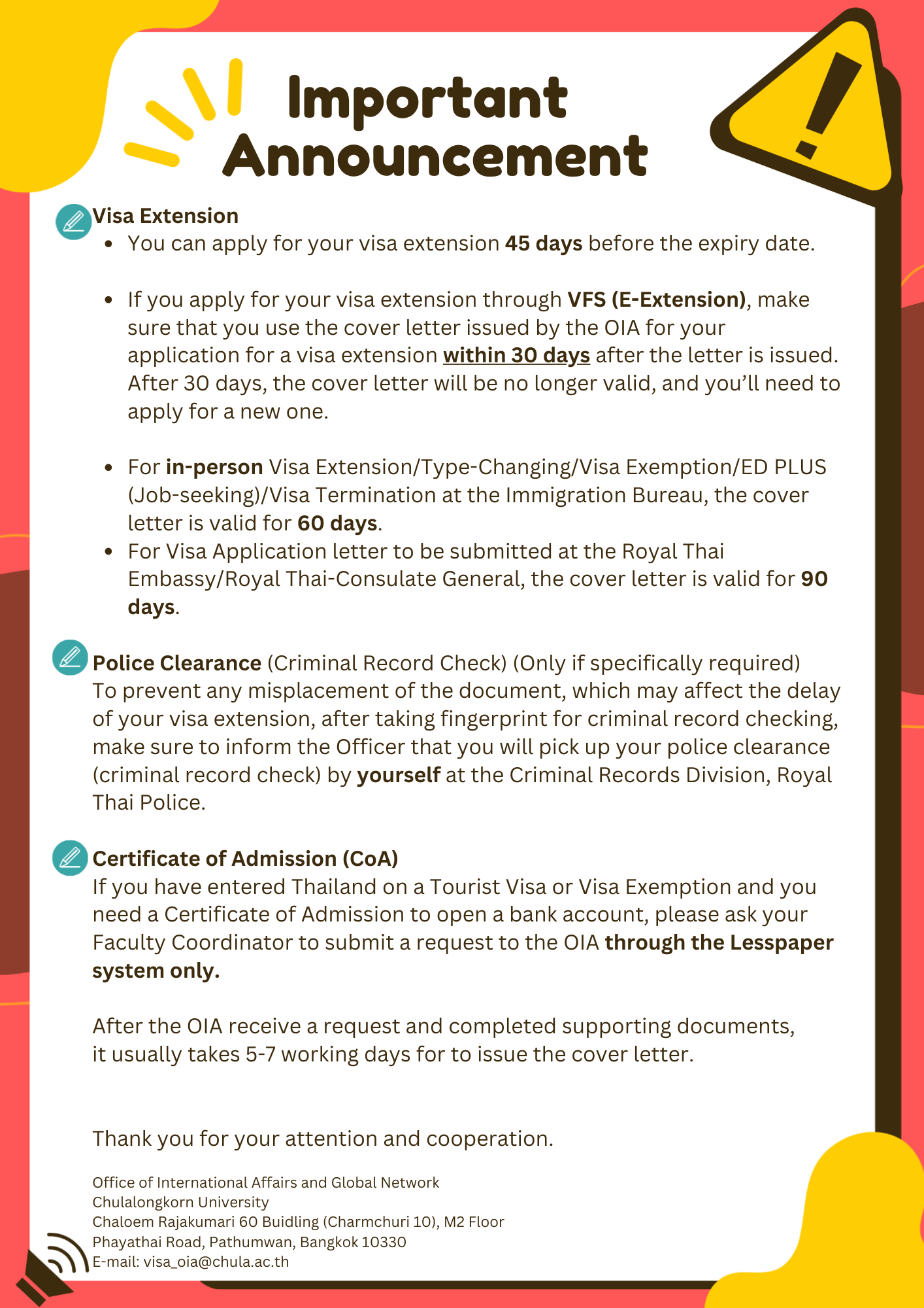 Should you have any questions about VISA, please contact: visa_oia@chula.ac.th or call: +66 2218 3127